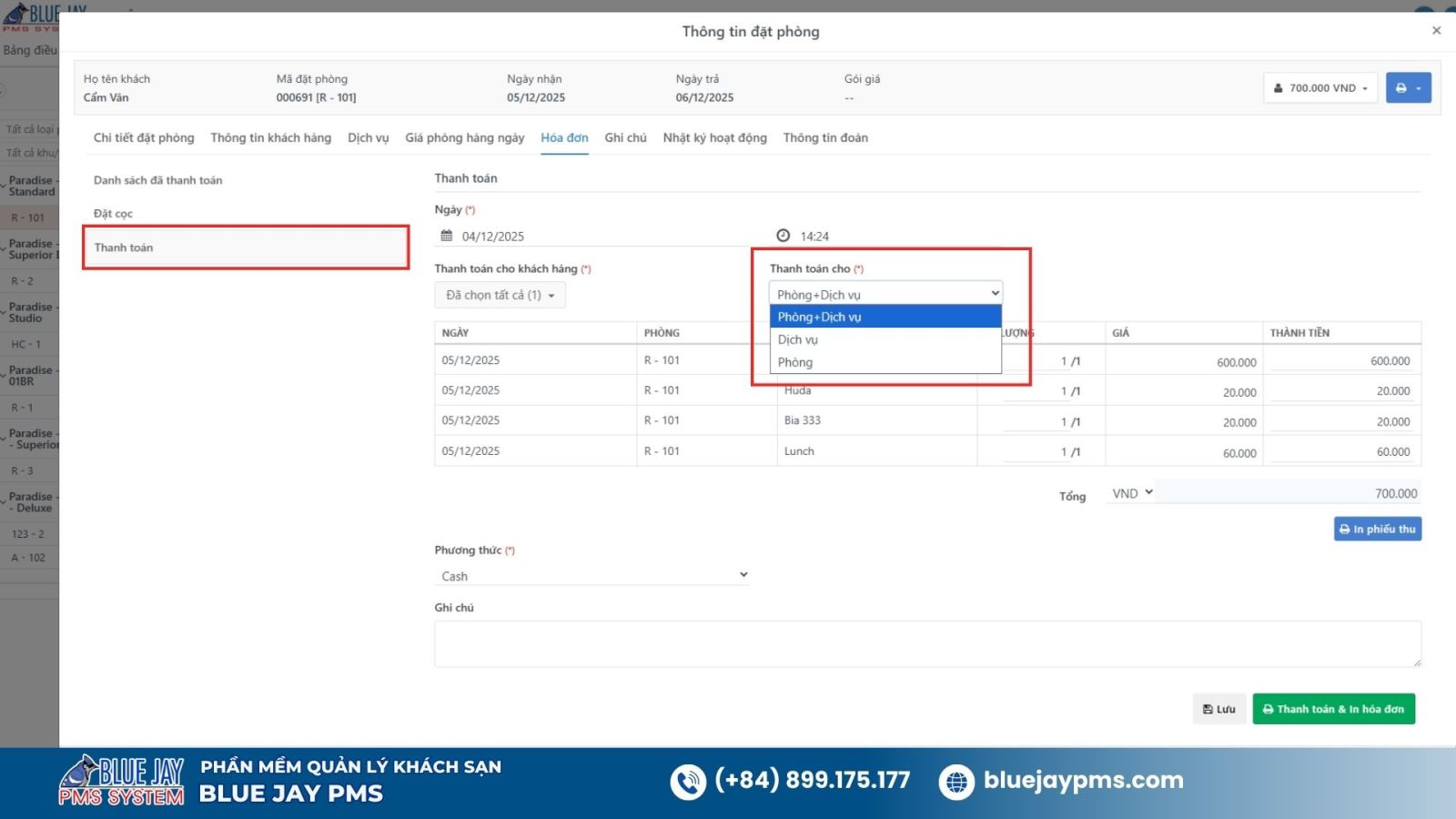 - Tách hóa đơn tiền phòng và dịch vụ cá nhân
