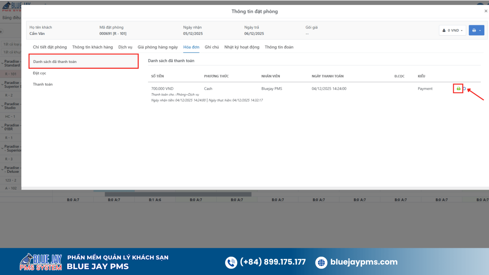 c. Khi bấm “Thanh toán & In hóa đơn” ⇒ Hiển thị chi tiết hóa đơn đã thanh toán